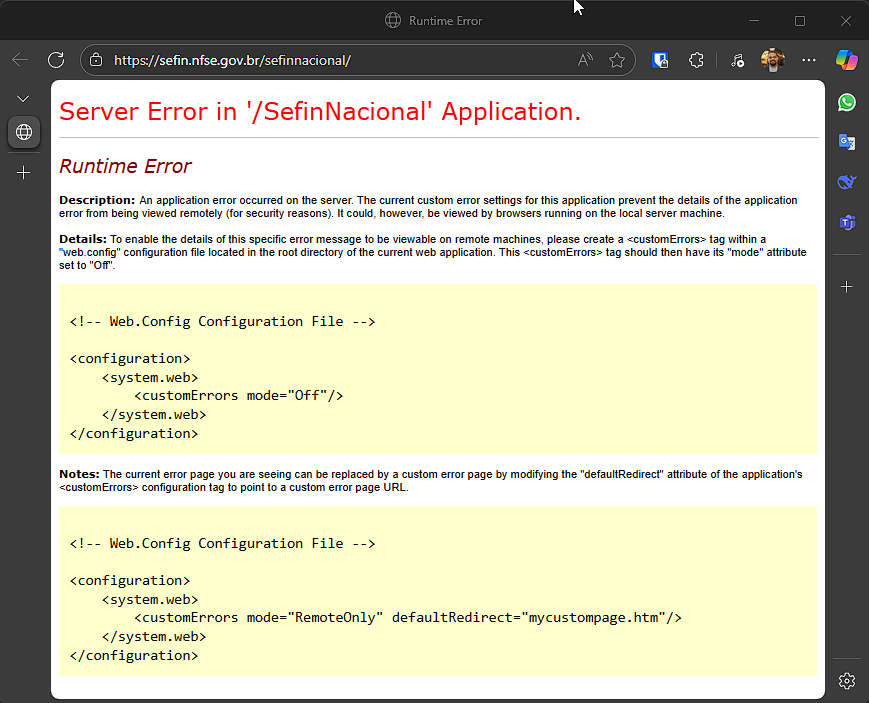 Identificamos que o Sistema Nacional de NFS-e não está operando (https://sefin.nfse.gov.br/sefinnacional).